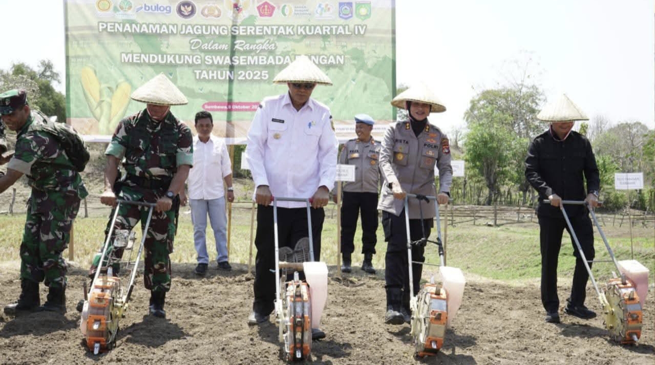 Sumbawa, SIAR POST — Bupati Sumbawa, Ir. H. Syarafuddin Jarot, MP menegaskan dukungan penuh Pemerintah Kabupaten Sumbawa terhadap upaya Polri memperkuat ketahanan pangan nasional, termasuk rencana penambahan dua gudang ketahanan pangan di wilayah Sumbawa. Komitmen tersebut disampaikan Bupati saat menghadiri kegiatan Penanaman Jagung Serentak Kwartal IV Tahun 2025, yang dilaksanakan di lahan Gabungan Kelompok Tani (Gapoktan) Kecamatan Moyo Utara, Rabu (8/10).