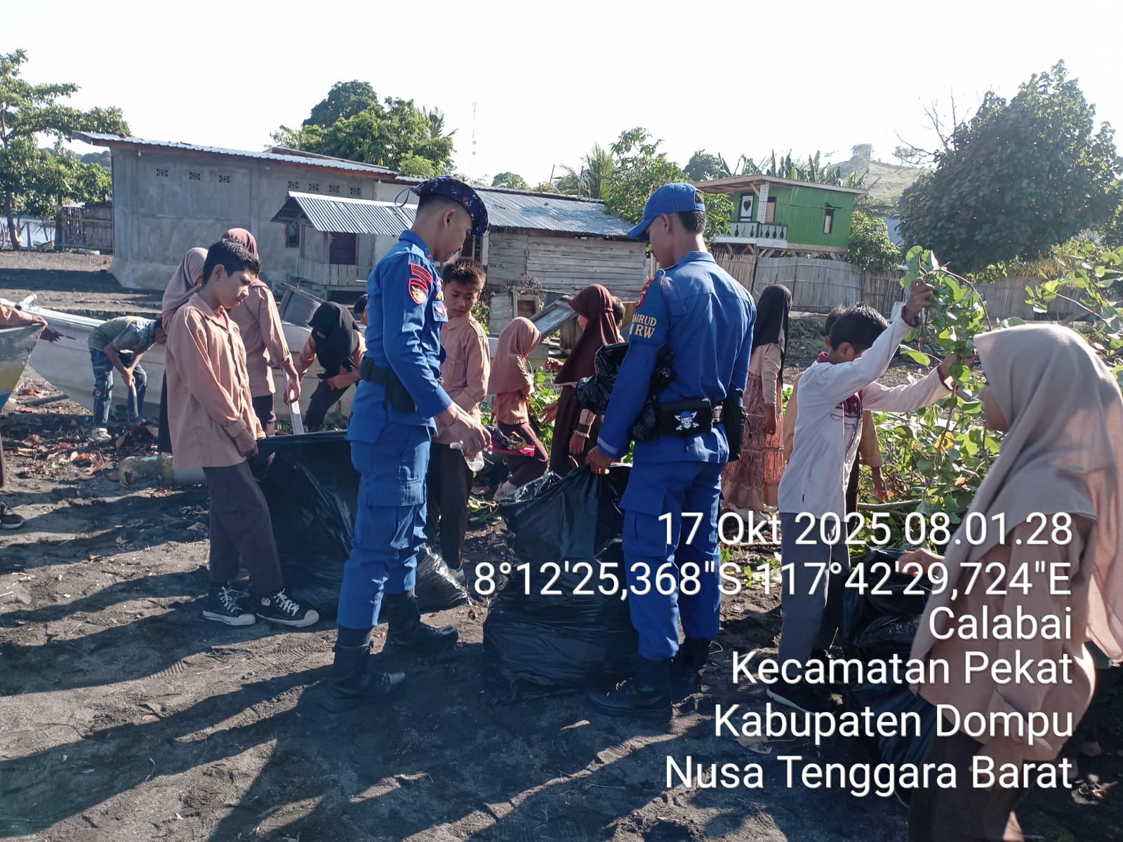Dompu, NTB (SIAR POST) – Personel Kapal Polisi XXI – 2014 Ditpolairud Polda NTB bersama warga Desa Calabai, Kecamatan Pekat, Kabupaten Dompu, Nusa Tenggara Barat (NTB), menggelar aksi gotong royong membersihkan Pantai Sigi dan menanam pohon pelindung. (17/10/2025)