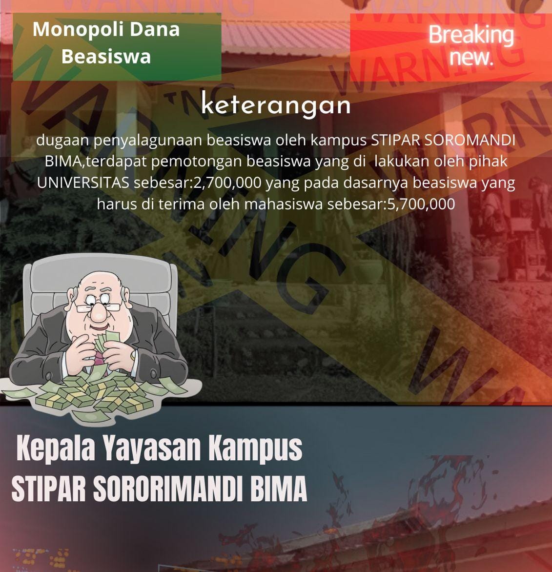 BIMA, SIAR POST | Dugaan praktik penyimpangan dalam penyaluran dana beasiswa mencuat di lingkungan Sekolah Tinggi Pariwisata (STIPAR) yang berlokasi di Desa Punti, Kecamatan Soromandi, Kabupaten Bima, Nusa Tenggara Barat. Kampus tersebut dituding melakukan Pemotongan Beasiswa terhadap sebagian besar mahasiswanya, serta Tetap Memberikan Beasiswa Kepada Mahasiswa Yang Sudah Berstatus Menikah yang sejatinya tidak lagi memenuhi syarat penerima bantuan pendidikan.