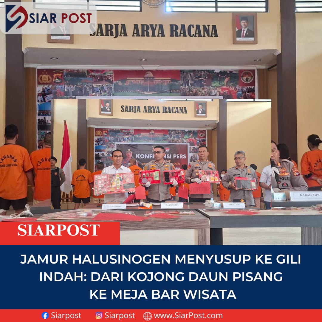 Lombok Utara ,SIARPOST— Peredaran narkotika di kawasan wisata kembali menunjukkan wajah baru. Bukan lagi sekadar sabu, tetapi jamur halusinogen atau mushroom yang diolah rapi, dikamuflase sebagai sajian makanan dan minuman di bar-bar wisata Gili Indah. Praktik ini terbongkar setelah aparat kepolisian mengungkap jaringan peredaran narkotika yang terhubung langsung dengan wilayah Pemenang.